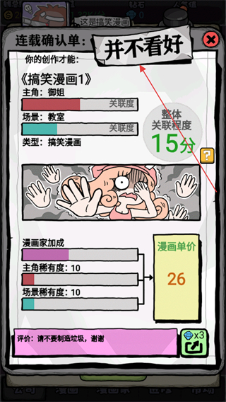 4、需要对制作漫画连载的评估界面,展示了搞笑漫画1的角色、场景等元素的关联度,整体关联程度评分为15分,创作才能被评为了并不好看。