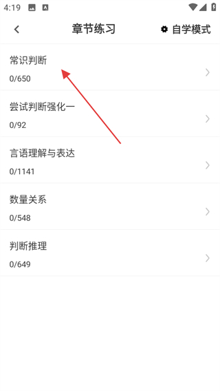 2、在章节练习页面,点击常识判断选项,进入常识判断练习页面。