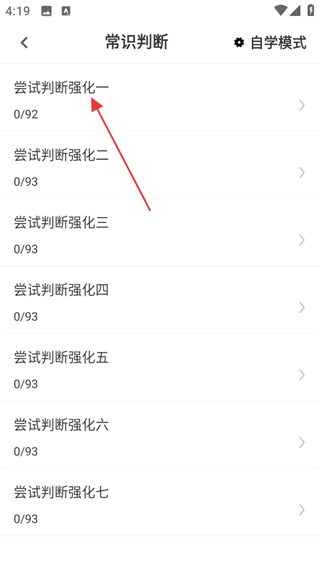 3、在常识判断页面,点击尝试判断强化一选项,进入题型选择页面。