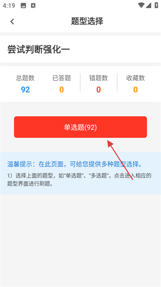 4、在题型选择页面,点击单选题选项,即可进入该题型做题。