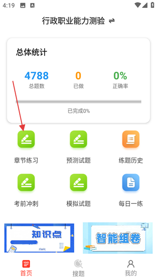 1、在三支一扶百分题库首页,点击章节练习选项,进入章节练习页面。