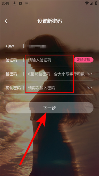 5、在设置新密码页面,获取短信验证码后,依次填写后,点击下一步,即可完成密码设置。
