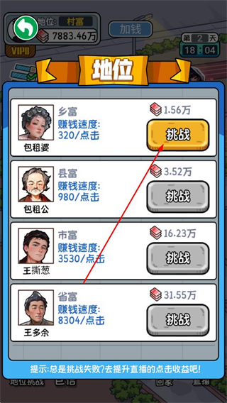 2、在地位列表中选择可挑战的对手,点击挑战进入财富博弈环节。