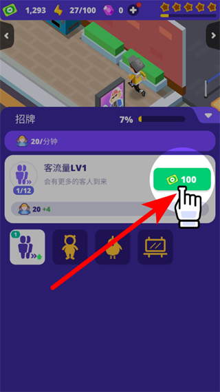 3、在设施操作界面,点击升级按钮,提升客流量等级增加客人数量。