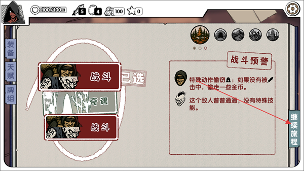 1、进入界面后看到战斗预警,了解敌人有特殊动作偷窃,选战斗后点继续旅程即可进入战斗环节。