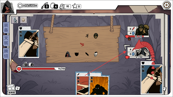 2、战斗界面中可使用防御卡牌防护,也能用轻击、蓄势卡牌攻击敌人,关注双方血量变化调整操作。