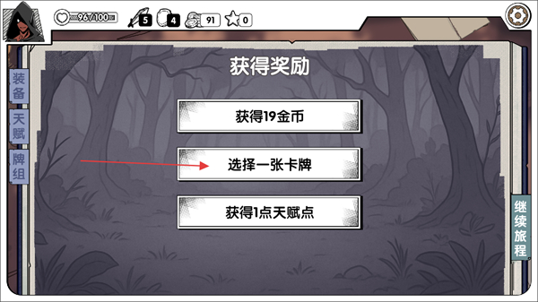 4、战斗胜利后会显示获得奖励,可获得19金币、1点天赋点,还需完成选择一张卡牌的操作。