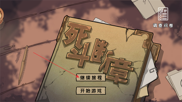 1、此为游戏初始界面,设有继续旅程、开始游戏操作按钮,右上角还有调查问卷选项,点击对应按钮可开启或恢复游戏进程。