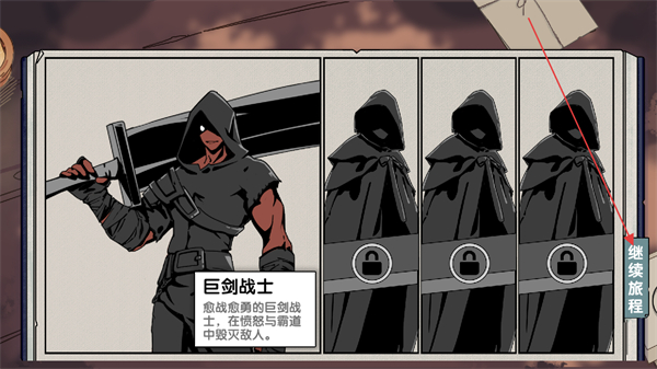 2、该页面可以选择角色巨剑战士特性为愈战愈勇,其余角色处于锁定状态,点击右侧继续旅程按钮即可选定角色进入后续流程。