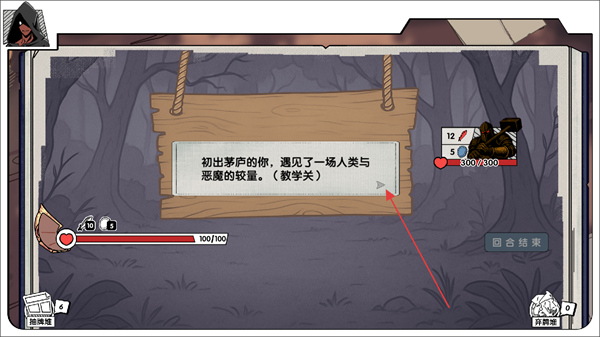3、此界面对应游戏教学关,点击提示框加快对话进度,同时显示角色与敌方状态,抽牌堆、弃牌堆等功能区域也已呈现。