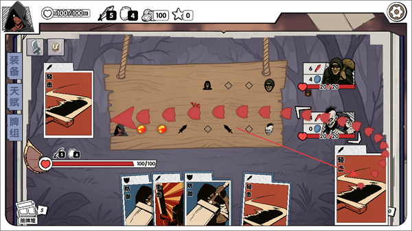 4、进入游戏战斗界面后,可使用轻击、重击、防御等卡牌执行战斗操作,界面展示敌方状态、抽牌堆与弃牌堆,通过使用卡牌推进战斗进程。