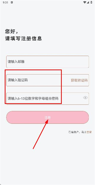 3、在注册账号页面填写验证码和密码,勾选协议后点击注册完成账号注册操作。