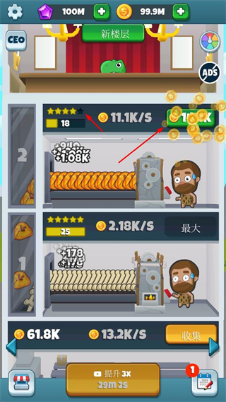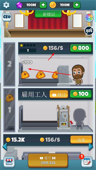 1、进入游戏界面后,点击雇佣工人按钮解锁工位,提升当前楼层的收益速度,为积累资源奠定基础。