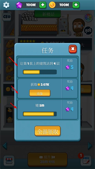 4、打开任务界面,完成指定任务目标,点击领取获取奖励,加速游戏进程。