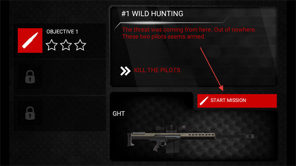 1、查看任务KILLTHEPILOTS,点击STARTMISSION开始任务,进入狙击场景。