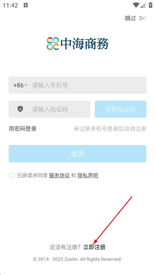 1、在中海商移登录页面,点击立即注册,进入账号注册页面。