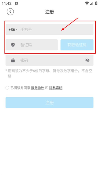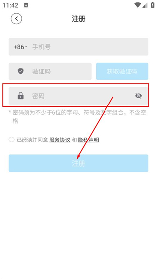 3、在注册页面,设置密码,勾选协议后点击注册,完成账号注册。
