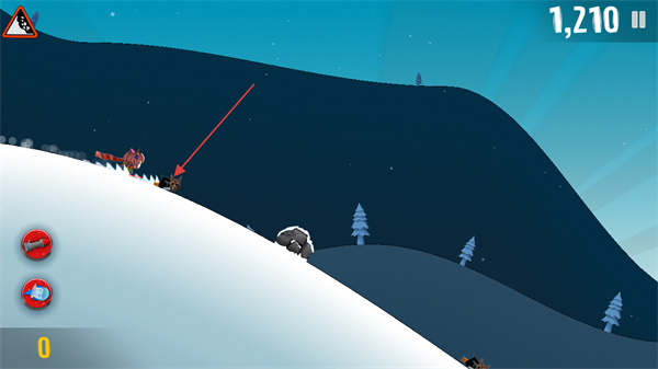 1、进入游戏后,角色处于雪坡顶端,需操控角色开始滑行,点击屏幕控制角色跳跃,避开场景中的岩石等障碍,推进滑行进程。