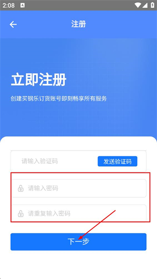 4、在注册页面,填写密码和确认密码对应的内容后,点击下一步,推进注册流程。