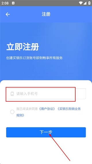 2、在注册页面,填写请输入手机号对应的内容,点击下一步。
