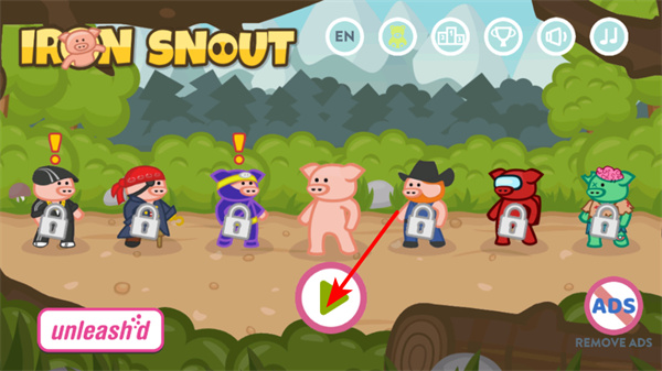 1、在角色选择界面点击对应的角色选项,这是进入游戏关卡的关键操作,选定后会开启冒险场景,展开小猪的战斗体验。