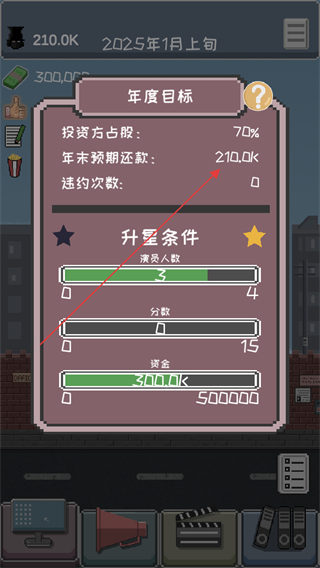 4、这是年度目标界面,需完成投资方占股、年末还款等目标,同时达成升星条件来运营制片厂。