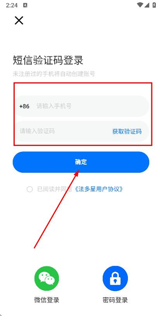 3、在登录页面填写手机号和验证码,勾选协议后,点击确定完成账号登录操作。