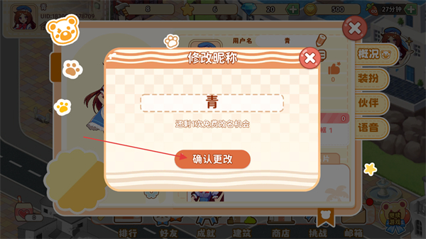 4、在修改昵称界面输入新昵称后,点击确认更改完成昵称修改,注意该操作有次数限制。