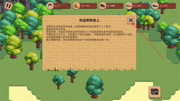 2、进入游戏后出现欢迎来到岛上的信息界面,点击右上角的关闭按钮,可关闭该界面并进入游戏的主操作场景。