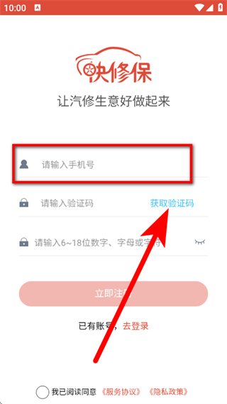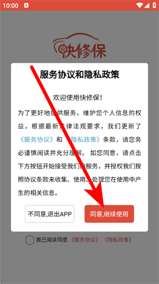 1、打开快修保,弹出提示框,点击同意,进入登录界面。