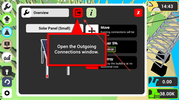 4、打开太阳能板的OutgoingConnections输出连接窗口,将其与变压器连接,搭建完整的电力供应链路。