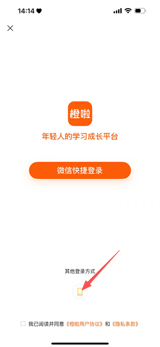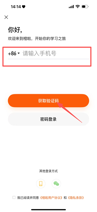 5、最后我们在输入验证码页面,填写收到的验证码,完成橙啦账号的登录操作。