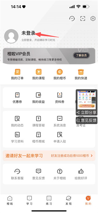 1、在橙啦的首页,点击底部我的选项,进入个人中心页面。