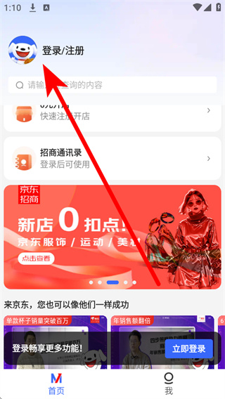 1、打开京麦工作台,在首页点击左上角的登录注册,进入对应页面。