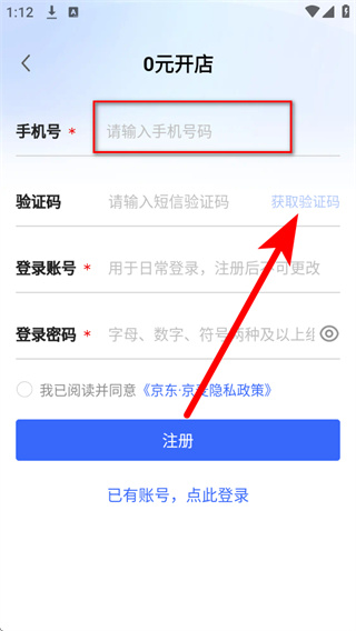 3、在注册页面的手机号输入框中填写手机号,点击获取验证码,将收到的短信验证码框。