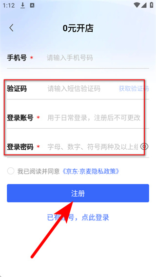 4、填写登录账号,并设置符合要求的登录密码,勾选复选框后,点击注册,即可完成注册操作。