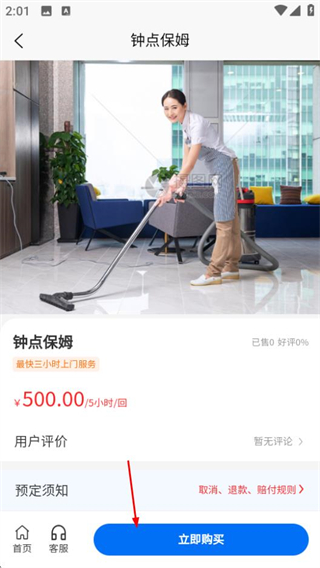 2、在钟点保姆页面,点击立即购买按钮,进入服务规格选择窗口。