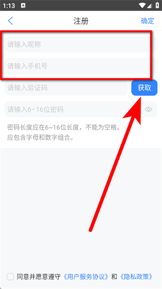 3、在注册页面,输入昵称和手机号,点击获取验证码。