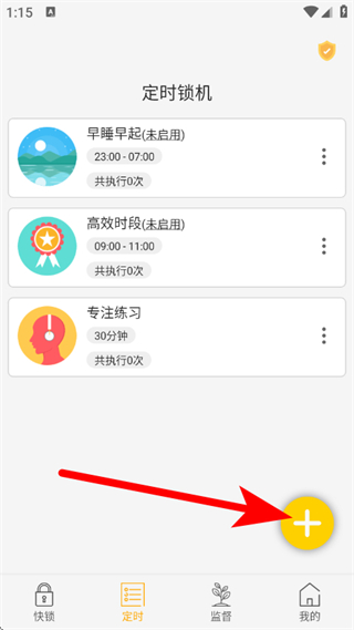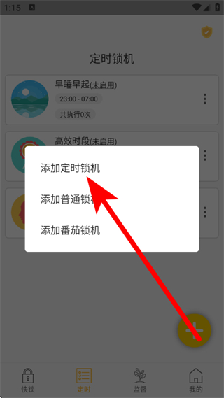 2、在定时锁机页面,点击黄色加号,弹出操作选项菜单。