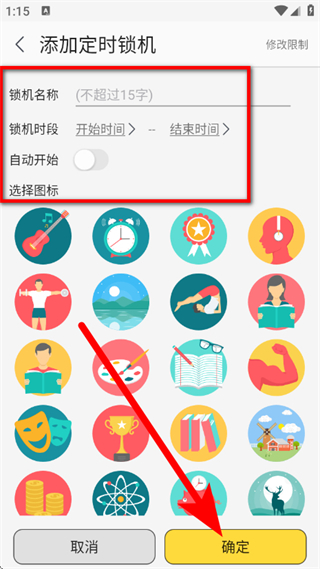 4、在添加页面,填写信息并选择图标后,点击确定,完成定时锁机设置。