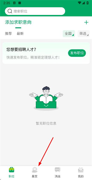 1、在职位页面点击底部的悬赏选项,进入悬赏职位列表页面。