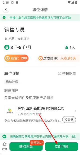 3、在职位详情页面点击立即沟通按钮,发起与招聘方的沟通。