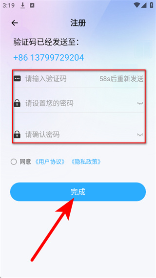 4、在验证码框填入短信验证码,完成相应的设置,勾选同意后,点击完成,即可完成账号和密码的注册操作。