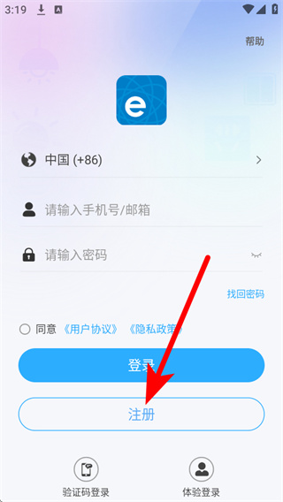 1、打开易微联,在登录页面点击注册,进入注册流程页面。