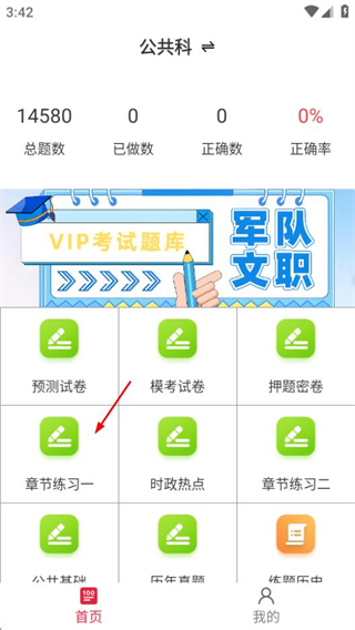 1、在军队文职鸣题库首页,点击章节练习一选项,进入章节练习页面。