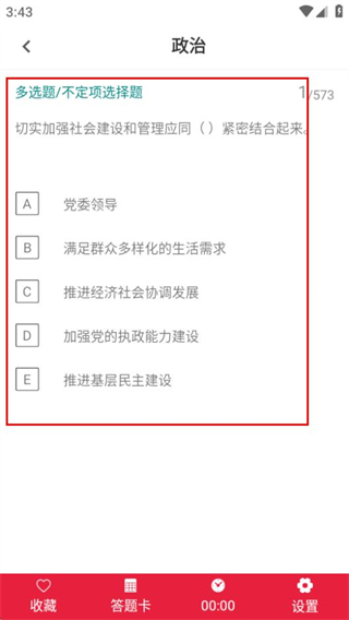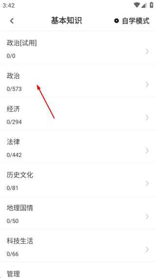 3、在分类页面,点击政治选项,进入政治题目的练习页面。