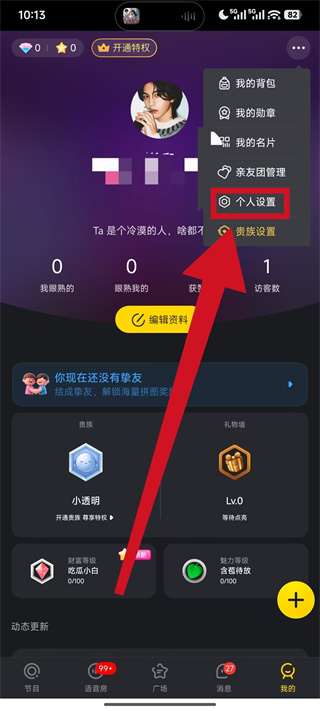 2、在个人页面右上角点击更多,弹出功能操作菜单。