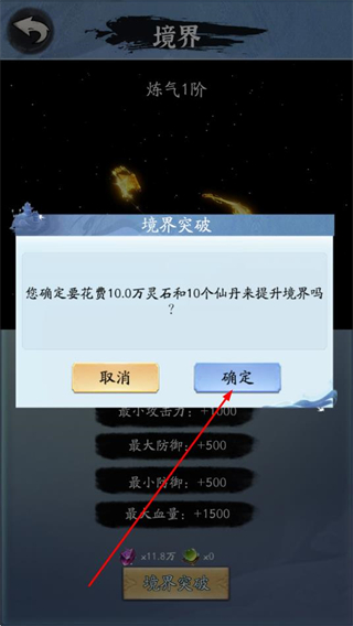 4、在弹出的境界突破确认窗口中,点击确定,消耗对应资源即可完成境界突破。
