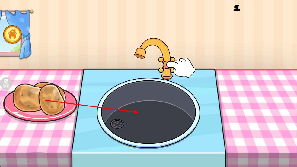 2、找到并点击水龙头的开关,让水槽中注入适量的水,再将土豆放入水槽内进行清洗处理。