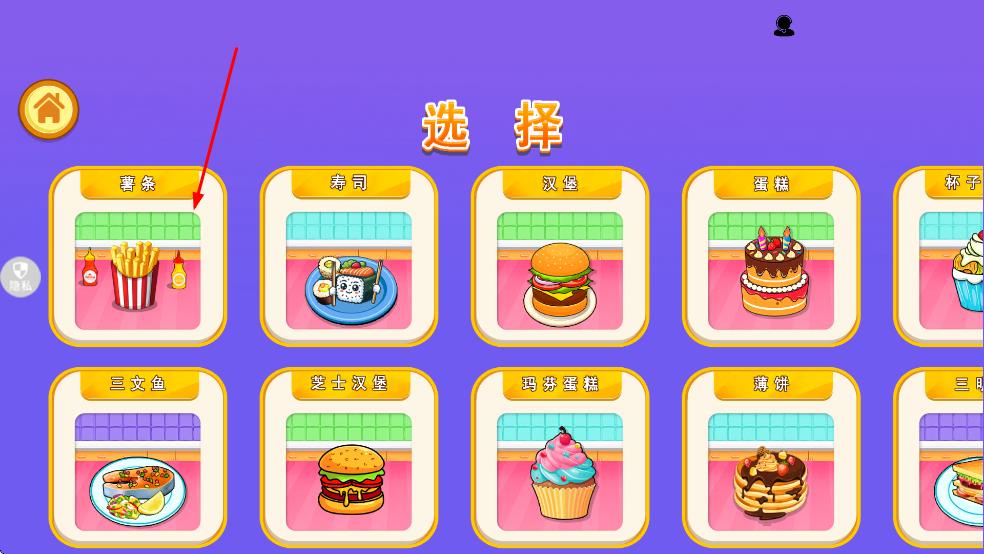 1、点击界面中的绿色播放按钮,进入美食选择页面,选择薯条对应的选项并点击该选项。